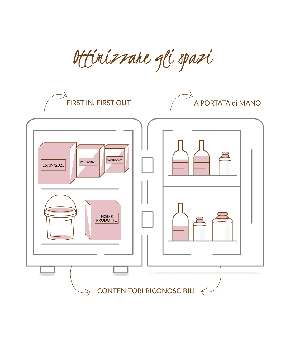 First In, First Out : Gli alimenti acquistati per primi (First In) vanno usati prima (First Out), quindi i prodotti con scadenza vanno posizionati davanti.